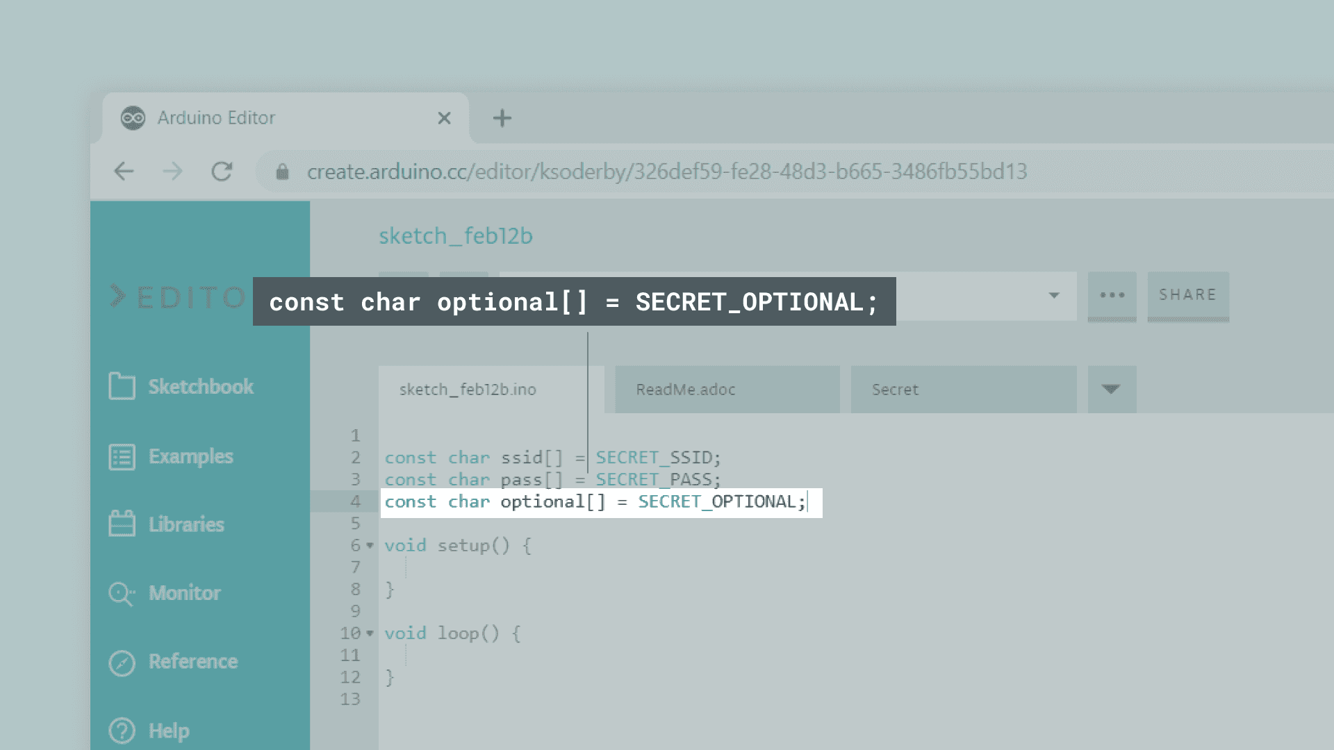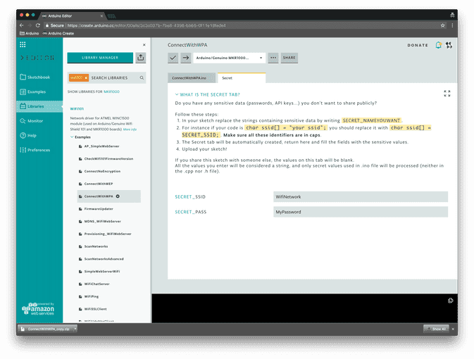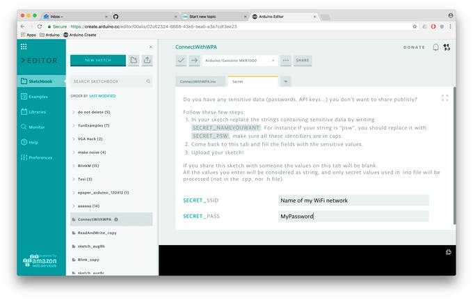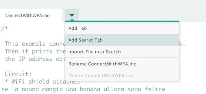 Often in your sketch, there is some sensitive data that you’d like to keep private, which could accidentally become public when published on GitHub or when you share your sketch with someone else via URL. This sensitive information may include Wi-Fi network names and passwords, API key, and so on. But now, you can add a secret tab to your sketch and store your private data there.