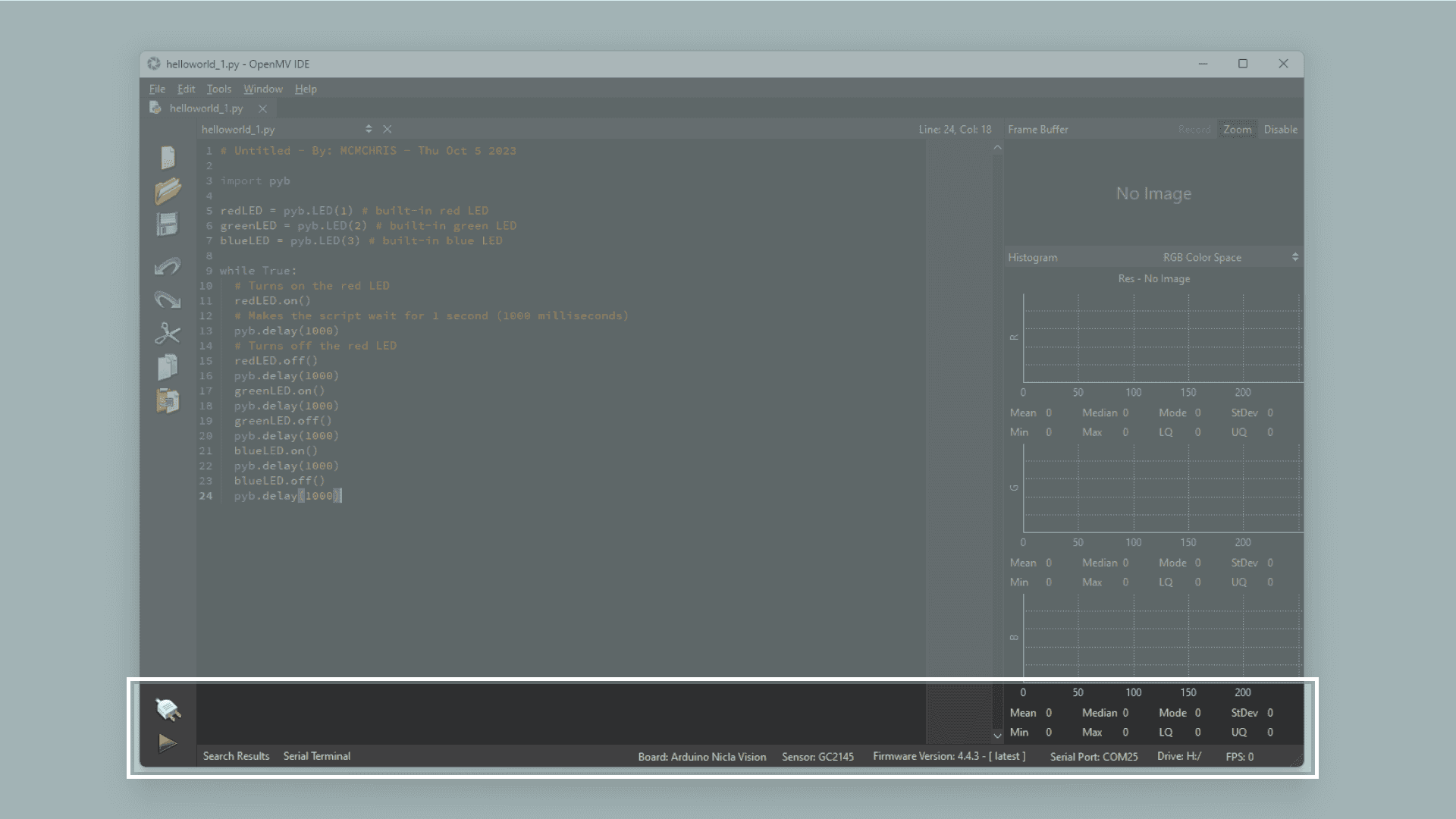 9 # Turns on the red LED10 redLED.on()11 # Makes the script wait for 1 second (1000 milliseconds)12 pyb.delay(1000)13 # Turns off the red LED14 redLED.off()15 pyb.delay(1000)16 greenLED.on()17 pyb.delay(1000)18 greenLED.off()19 pyb.delay(1000)20 blueLED.on()21 pyb.delay(1000)22 blueLED.off()23 pyb.delay(1000)Connect your board to the OpenMV IDE and upload the above script by pressing the play button in the lower left corner.