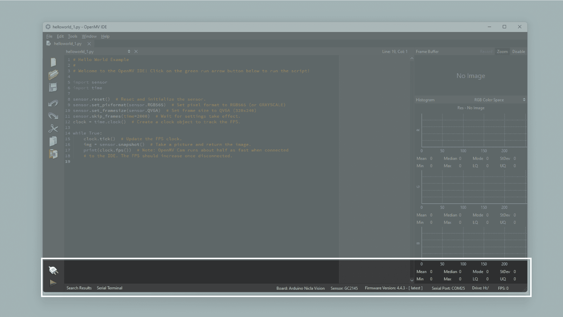 The OpenMV IDE is meant to provide an Arduino-like experience for simple machine vision tasks using a camera sensor. In this tutorial, you will learn about some of the basic features of the OpenMV IDE and how to create a simple MicroPython script. The Nicla Vision has OpenMV firmware on the board by default, simplifying the connection with the OpenMV IDE.