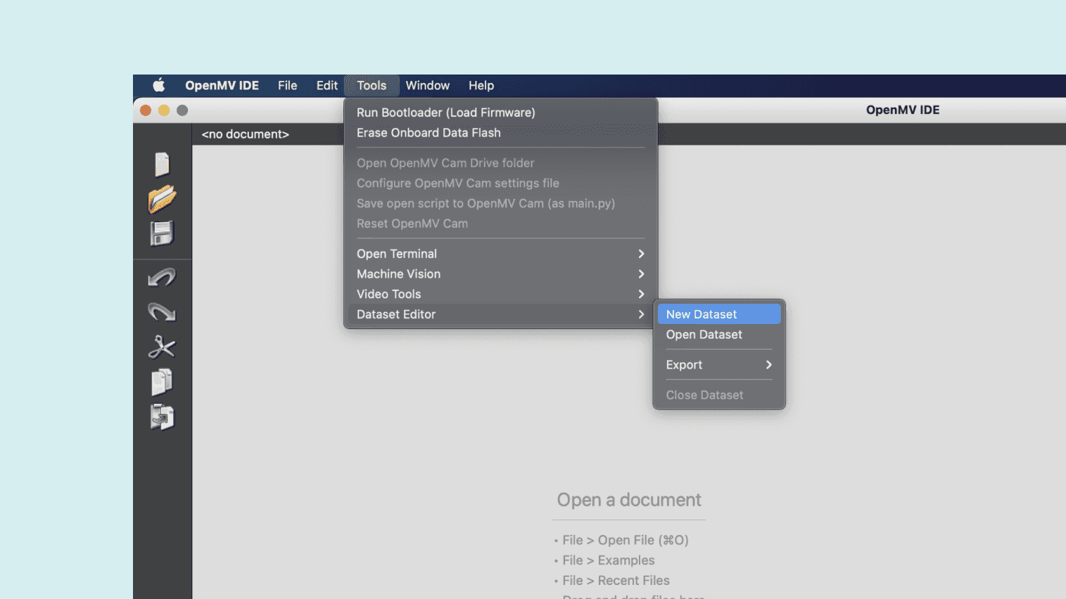 Creating data sets in OpenMV is simple as there is a built-in function to create them. Before you proceed, connect your Nicla Vision board. Click on the connect button in the OpenMV IDE. If you haven't set up your board for OpenMV please consult the getting started tutorial.